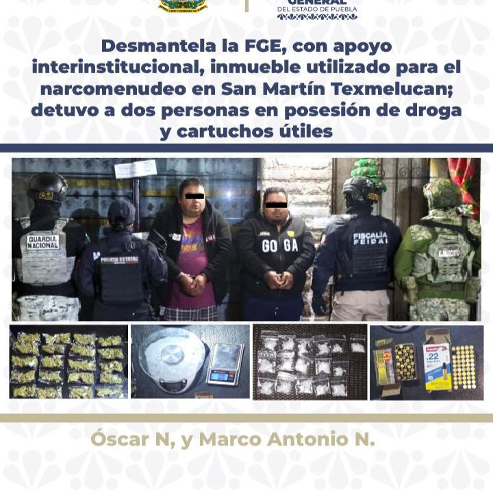 La Fiscalía General del Estado implementó, con apoyo interinstitucional, acciones operativas en San Martín Texmelucan, logrando desmantelar un inmueble utilizado para actividades de narcomenudeo; además, detuvo en el lugar a Óscar N. y Marco Antonio N., presuntamente en posesión de diversas dosis de estupefacientes y cartuchos útiles. En seguimiento a…
