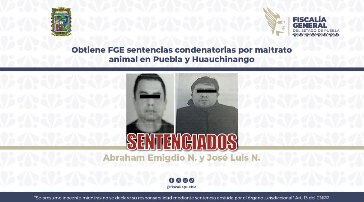 Como resultado de las acciones jurídicas, la Fiscalía General del Estado de Puebla (FGE) obtuvo sentencias condenatorias en contra de dos personas por su responsabilidad en el delito contra los animales mediante actos de crueldad, en hechos ocurridos en los municipios de Huauchinango y Puebla. En el primer caso, se…