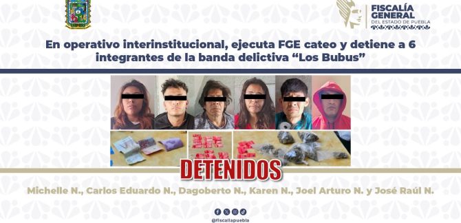 La Fiscalía General del Estado de Puebla (FGE) realizó un cateo que permitió la detención de seis personas presuntamente relacionadas con la venta y distribución de narcóticos en colonias y centros educativos ubicados al sur del municipio de Puebla. Derivado de labores de inteligencia, investigación de campo, verificación de denuncias anónimas y vigilancia operativa, se … Sigue leyendo Fiscalía detiene a seis por venta de droga en escuelas de Puebla